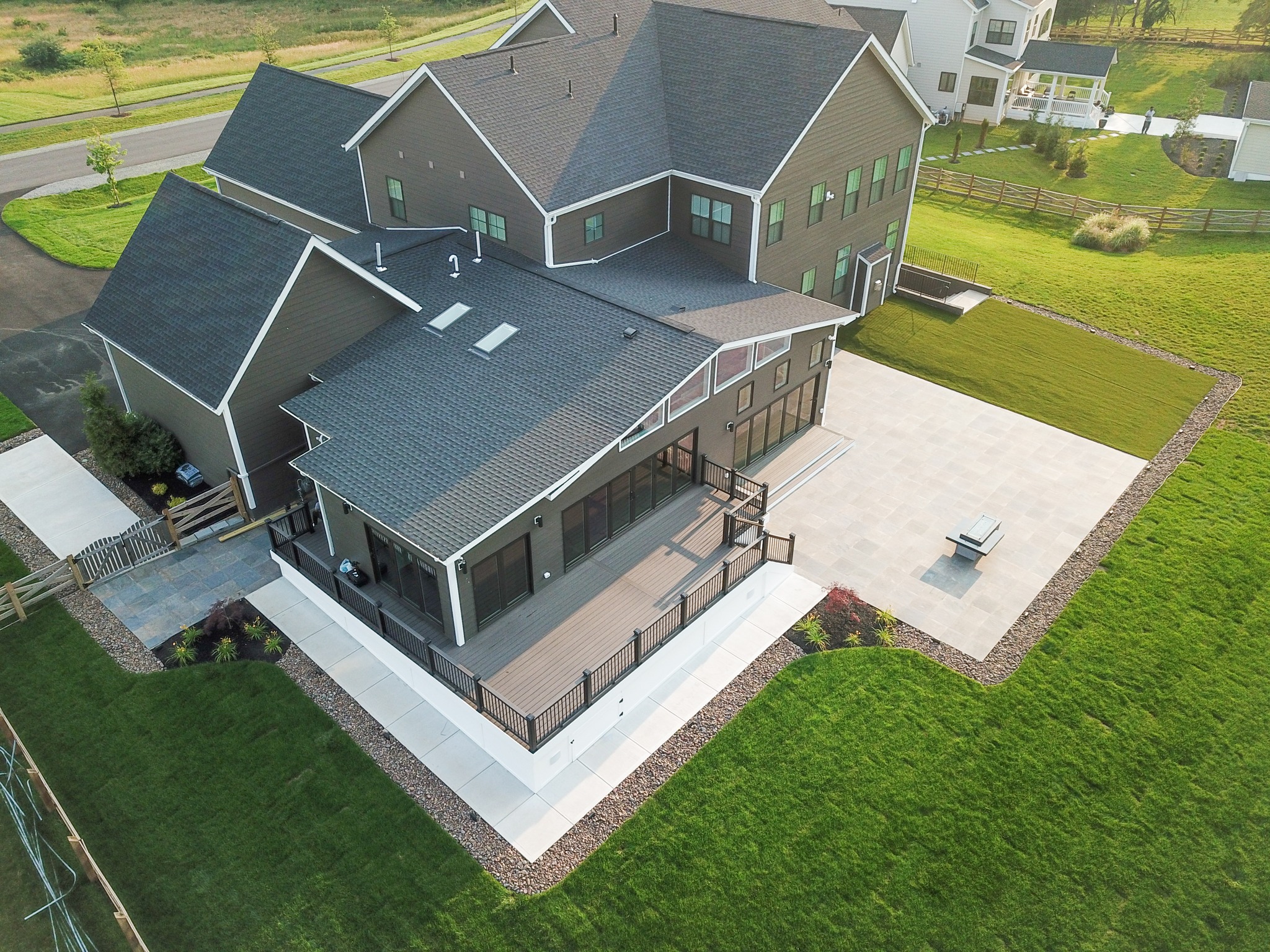 Aerial drone shot of a composite deck with screened porch enclosure and large porcelain patio below — a complete backyard outdoor living system.