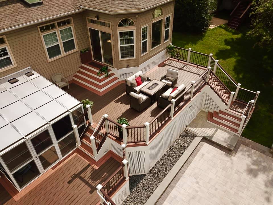 Multi-level composite deck with sunroom extension and integrated lower patio — captured from a drone showing the full scope of the outdoor transformation.