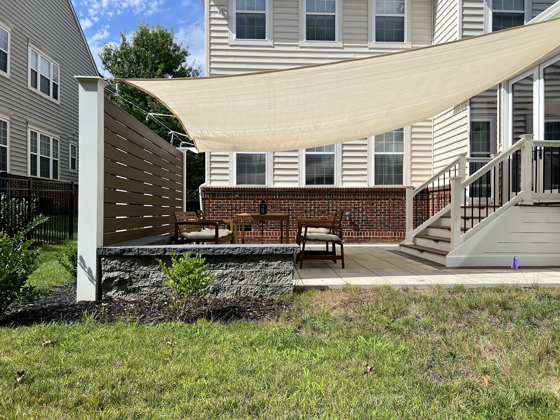 Real Blue Lightning client project featuring a clean paver patio, shade sail system, privacy screen, and seamless deck-to-patio transition. Photographed on completion day.