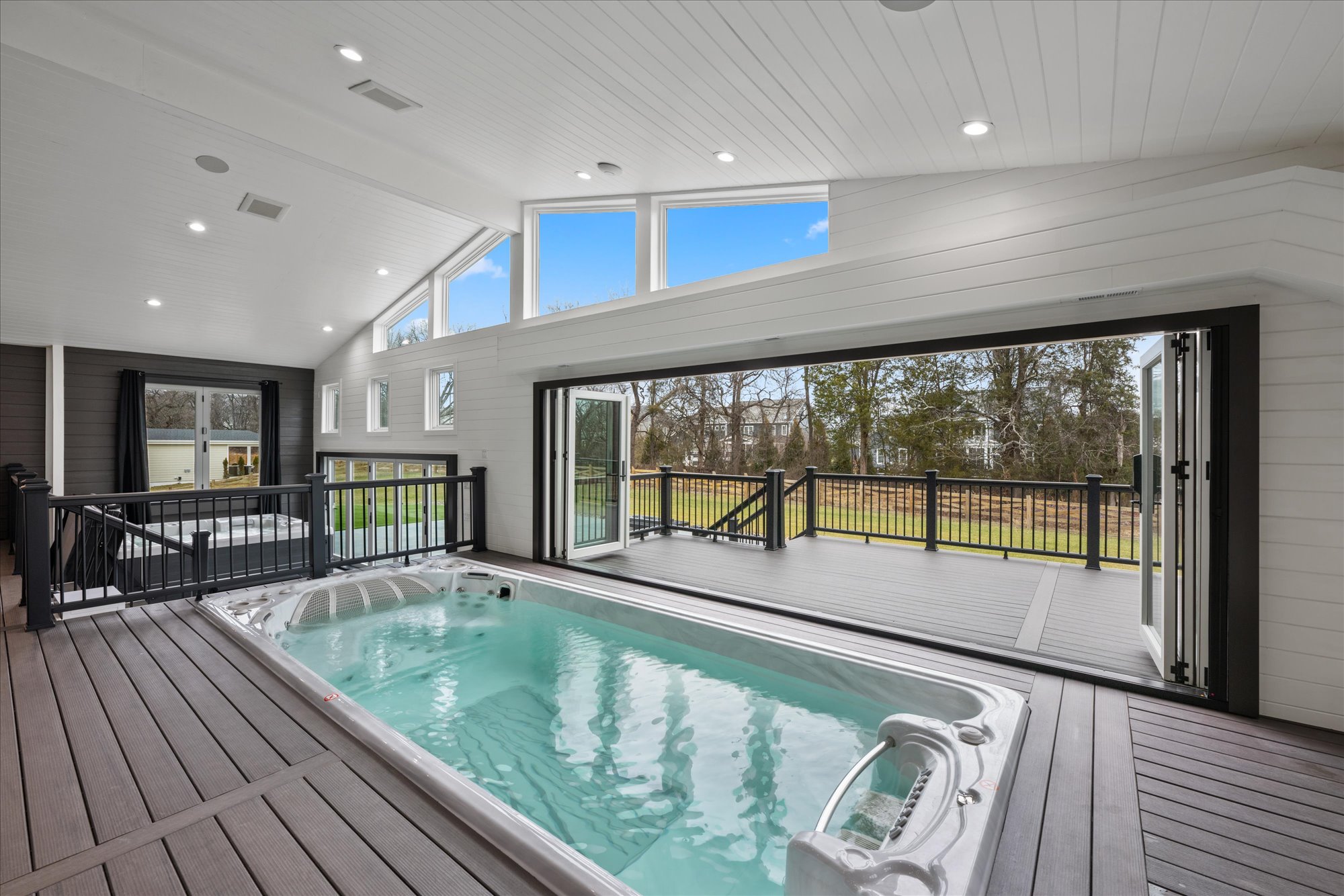 Fully enclosed covered pool room with indoor spa, double french doors, recessed lighting, and premium interior finish. One of our most ambitious structural builds.