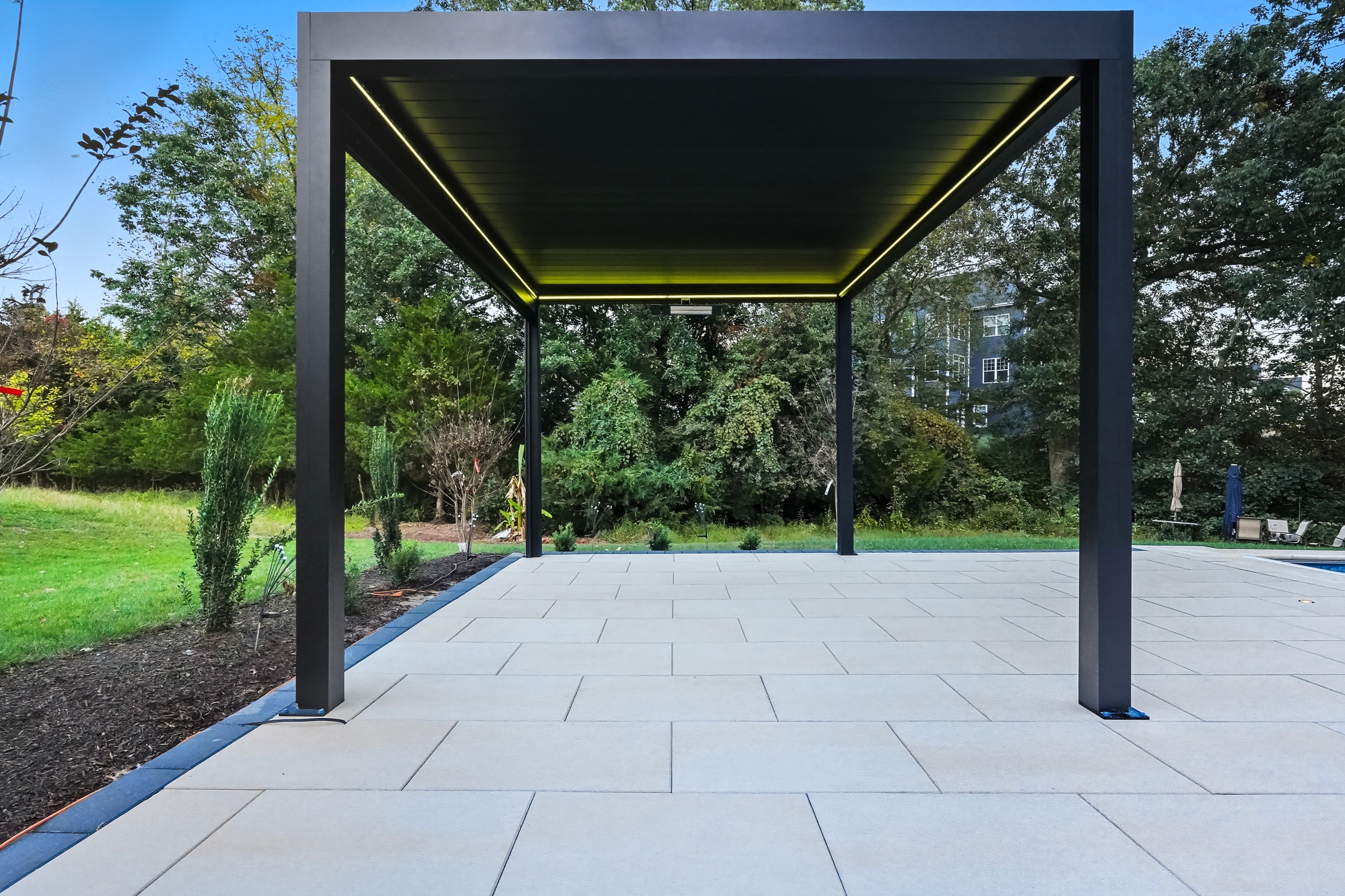 Louvered and flat-roof pergola systems installed over pool decks — dark aluminum and black-finish frames over porcelain and travertine pool surrounds.