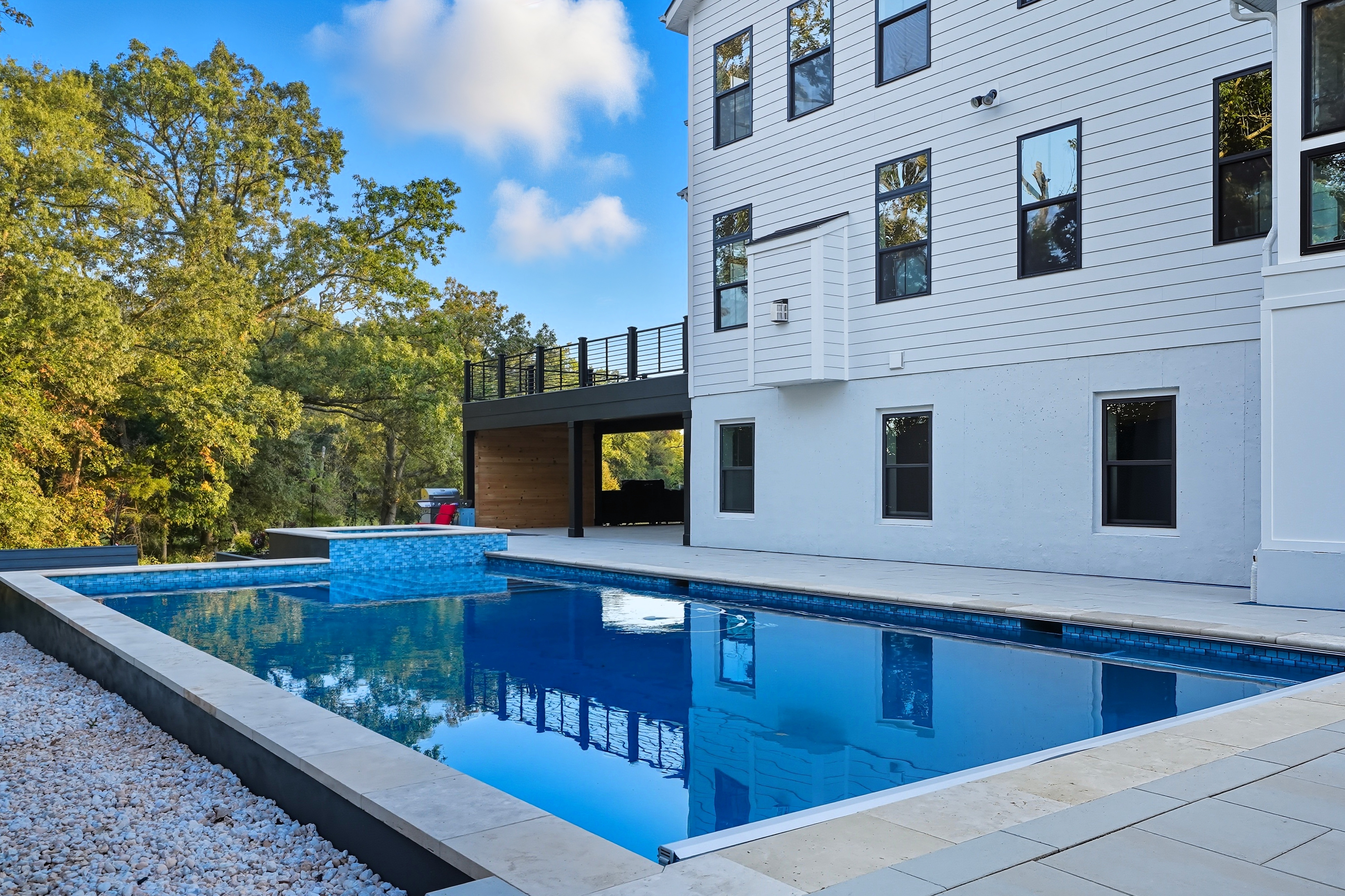 Premium porcelain pool surrounds showcasing blue-finish pools, integrated spas, pergola covers, and clean geometric design across multiple Northern Virginia projects.