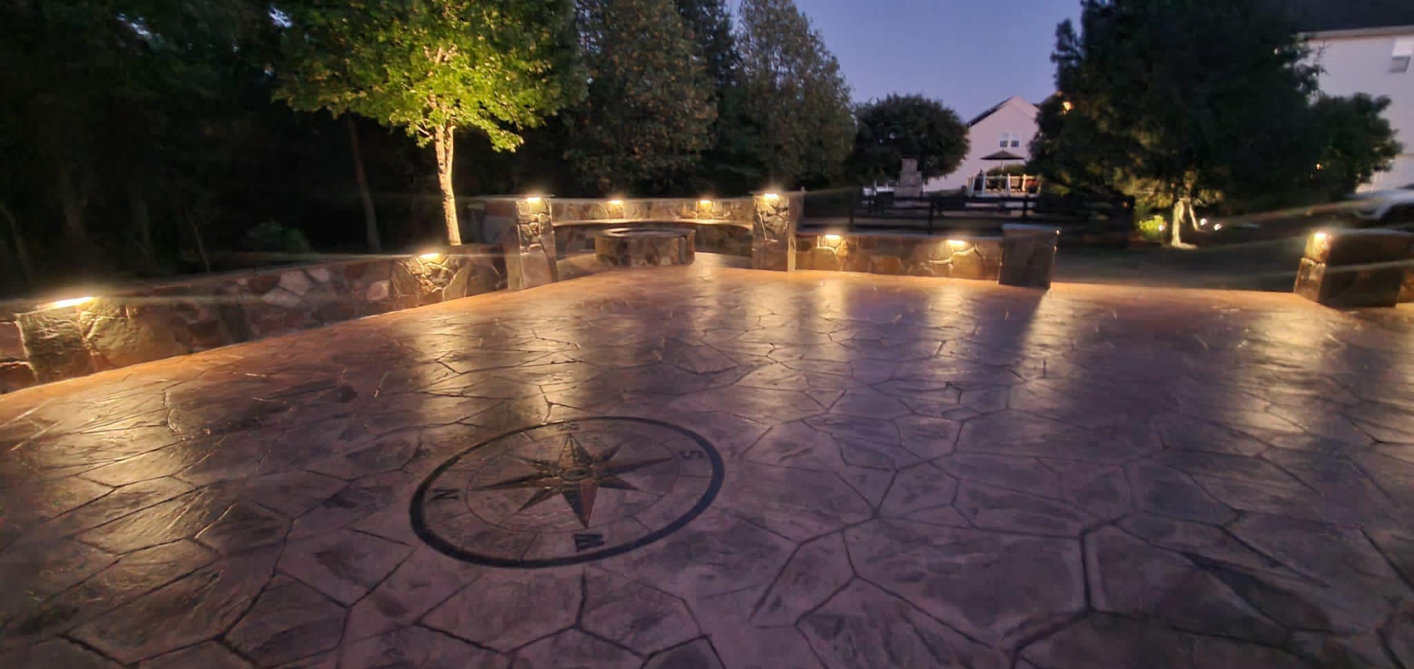 Real Blue Lightning project: large-scale stamped concrete patio with custom compass rose medallion, stone seat wall with built-in fire pit, and full landscape lighting.
