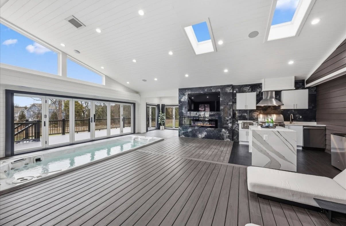 Extraordinary luxury build: fully enclosed indoor pool room with composite deck flooring, built-in kitchen, fireplace, and TV wall — an all-weather outdoor living wing.
