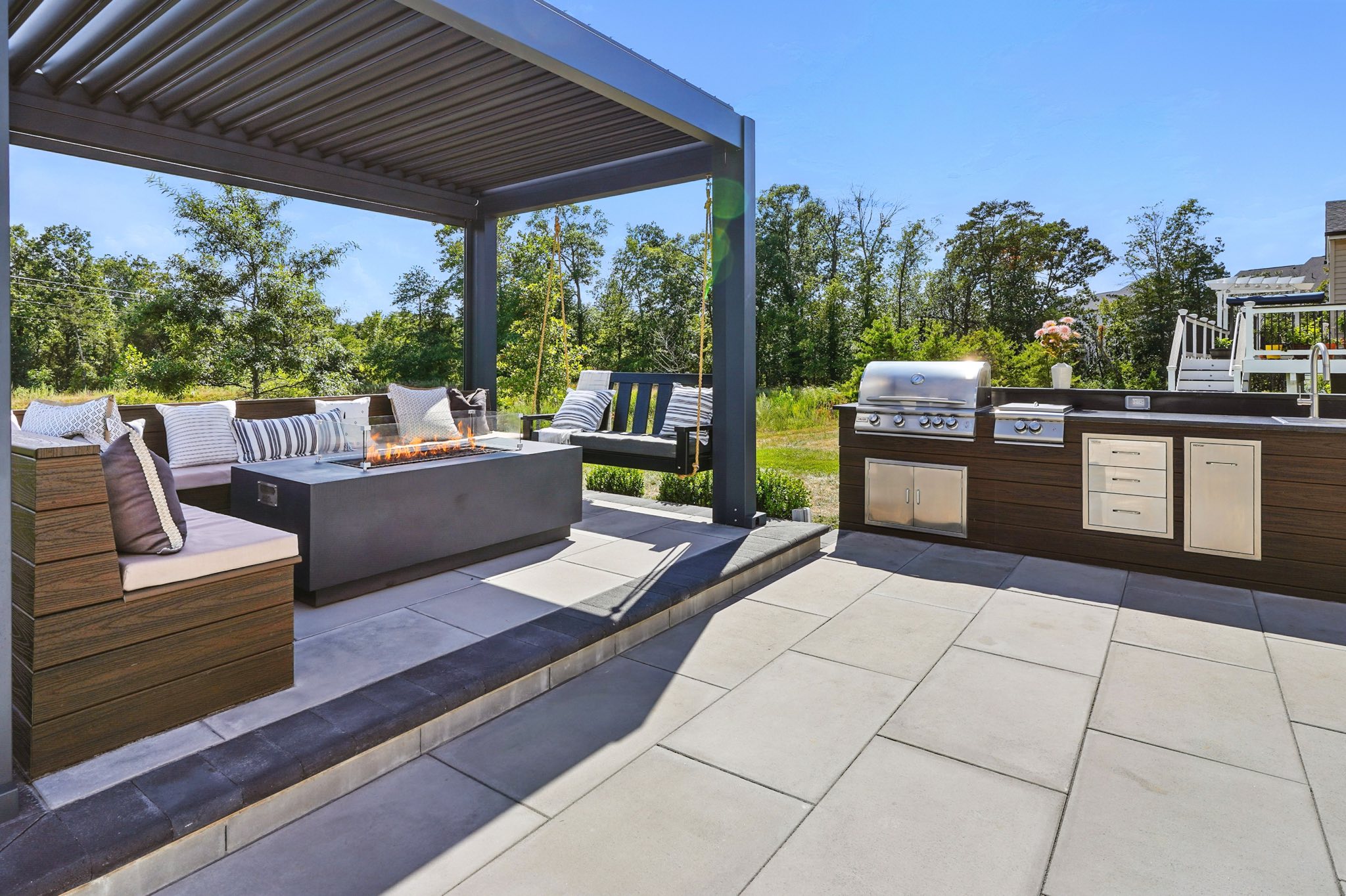 Premium real Blue Lightning project: dark aluminum louvered pergola over a full outdoor kitchen station on a large porcelain patio — built-in seating and fire table.