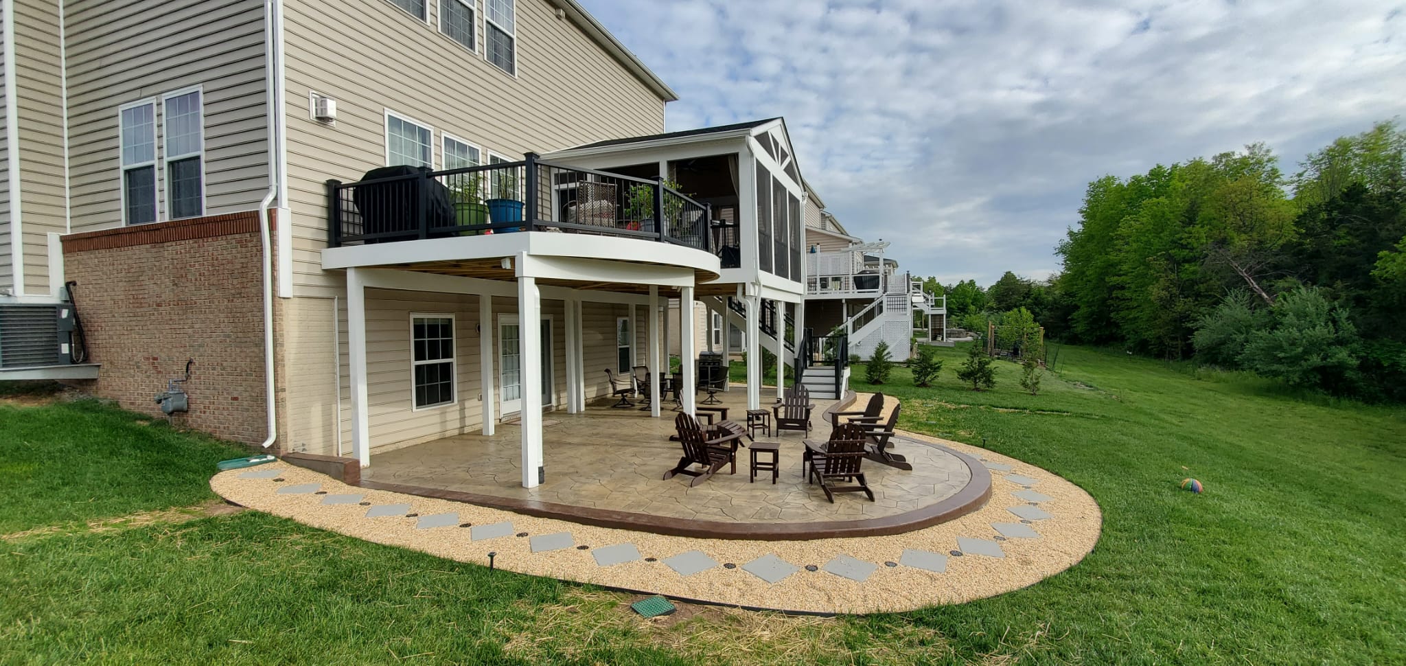 Real Blue Lightning project: curved stamped concrete patio built under an elevated composite deck — organic curved shape with border detailing and pea gravel accent.