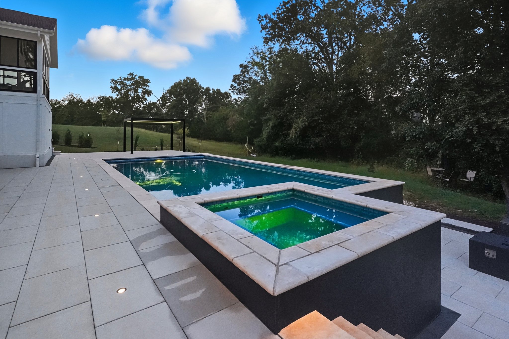 Real Blue Lightning project — porcelain pool deck with raised spa and integrated pergola structure in the background. Photographed at golden hour.