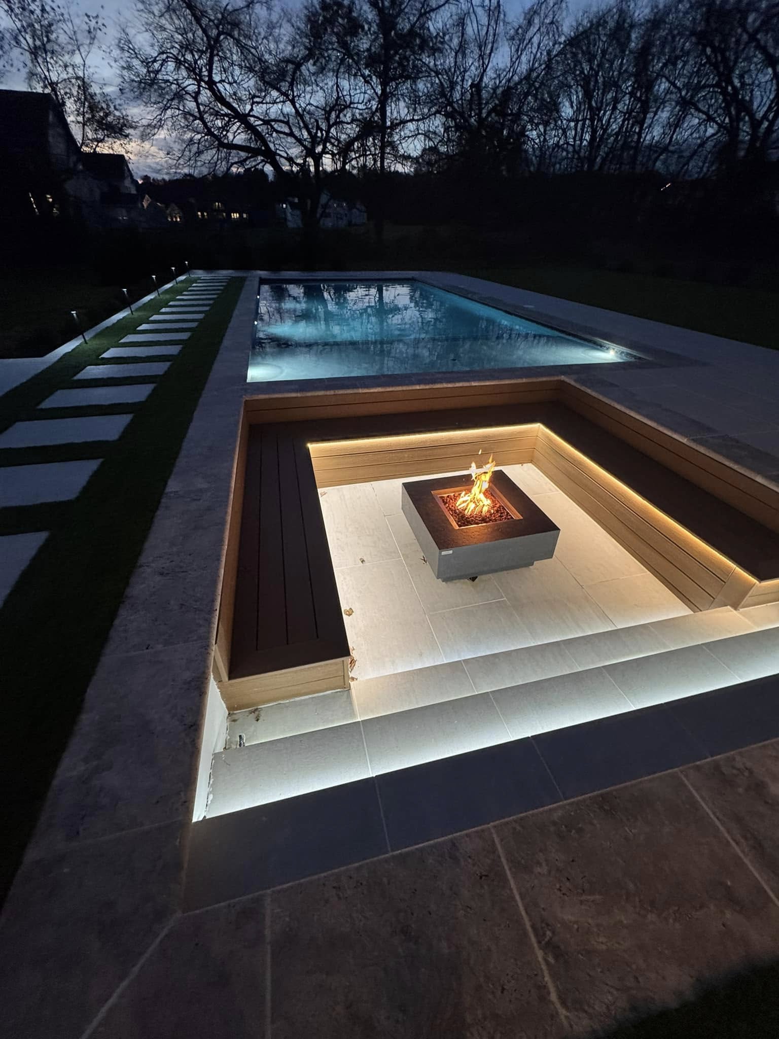 Real project: sunken composite bench lounge with integrated fire table, full LED strip lighting, and luxury pool in the background — photographed at night.